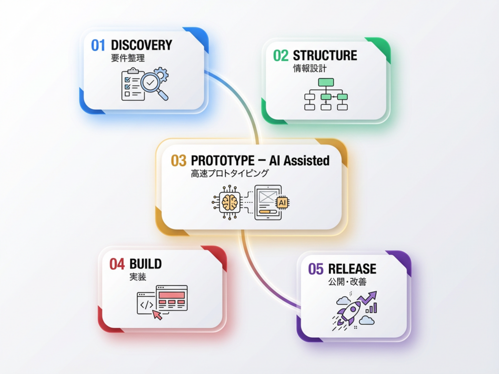 制作体制についても見直しを行いました。設計と実装を分断せず、一貫して進めるフローを採用。プロトタイピングの段階からAIを補助的に活用することで、修正の往復や意思決定の時間を短縮しました。